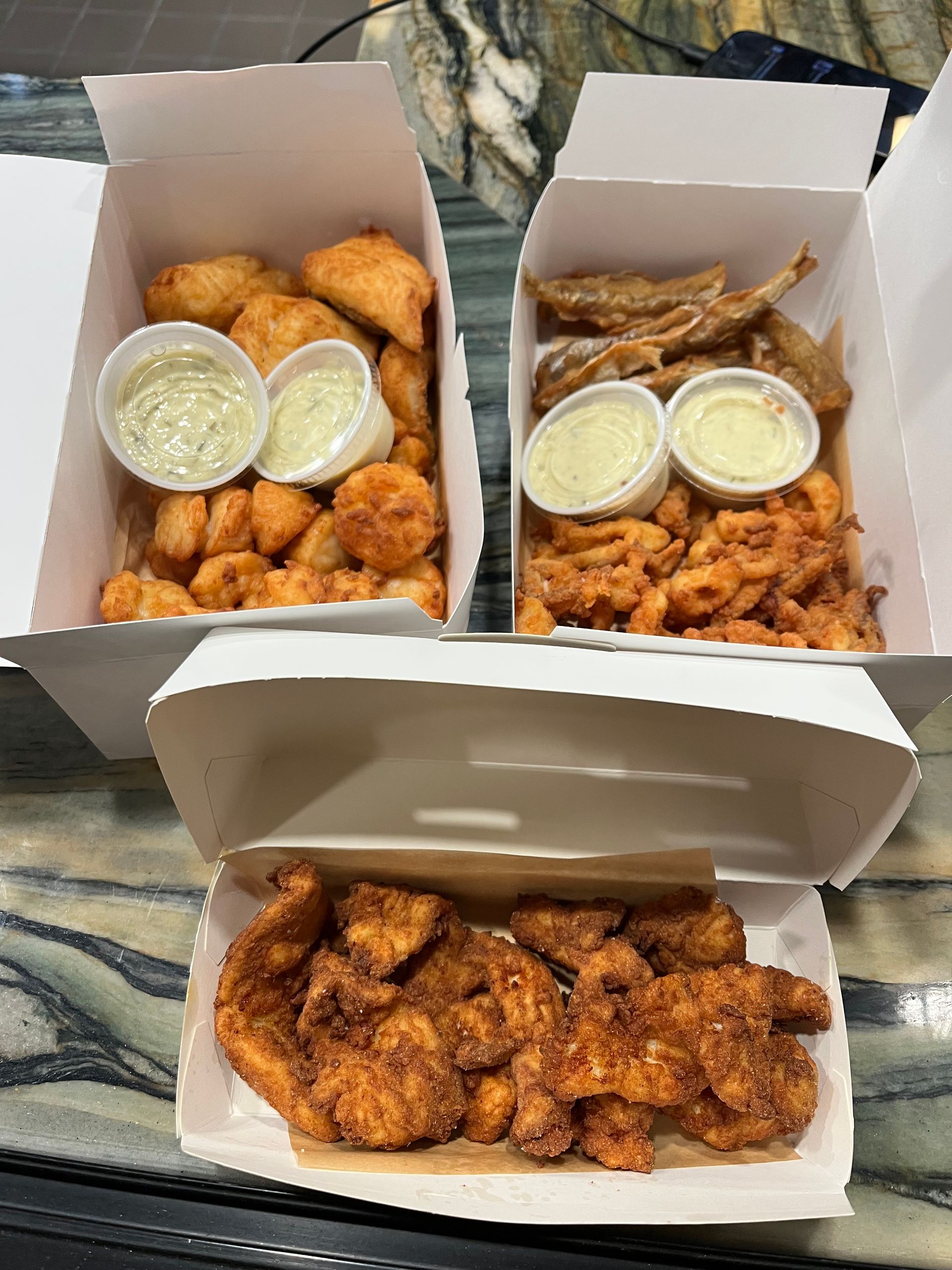 - Mixed fried seafood platter from a takeout window seafood shop